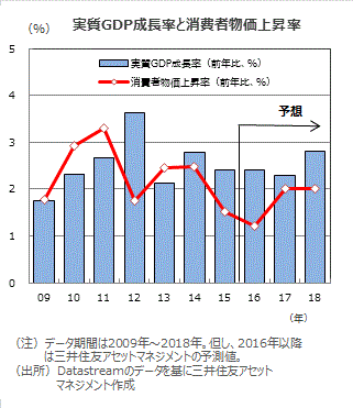 物価は緩やかに上昇■これまでの利下げ効果や労働市場の回復等から家計消費、住宅投資といった非資源セクターは、2017年も堅調に推移すると予想されます。年後半には、資源セクターによる設備投資の調整も一巡すると見られ、景気の拡大ペースは緩やかに高まると考えられます。17年の成長率は+2.3%程度が予想されます。