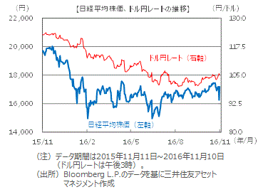 ■トランプ氏が通商や移民政策等について極端な発言を行う可能性はありますが、経済政策によって米国の景気拡大が力強さを増せば、日本株にとって追い風となります。昨日の下落はトランプ・リスクの負の側面をまずは織り込んだとも考えられます。
