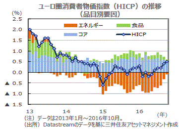 英国のEU離脱選択の影響は限定的■2016年7-9月期のユーロ圏の実質GDP成長率(速報値)は前期比+0.3%と、4-6月期と同水準の伸びとなりました。前期と同様に内需、特に個人消費の成長が続いたと見られます。英国のEU離脱選択が景気見通しの下振れリスクとして意識されていましたが、今のところ域内経済への影響は限定的と見られます。