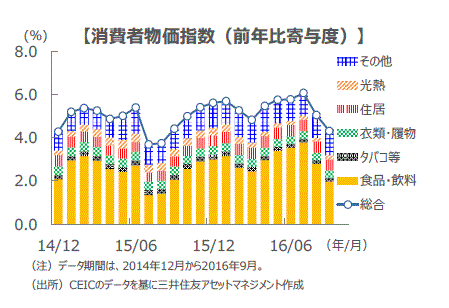 引き続き食品価格の低下が寄与■2016年9月の消費者物価指数(CPI)は前年比+4.3%と、8月の同+5.0%から大幅に鈍化し、市場予想(同+4.6%)をも下回りました。