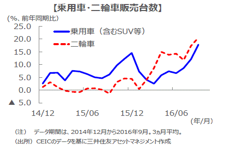 ■第7次給与委員会の勧告に基づく公務員賃金引上げ(1-7月分も含め8月に支給)、農産物生産増加(順調なモンスーン降雨が背景)による農村部の所得見通し向上と自動車ローン金利の低下などが、販売押し上げに寄与したものと考えます。