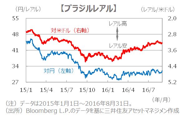 ■ブラジルレアルは、米国の利上げの先送りや資源価格の上昇に加え、テメル暫定政権による財政再建への期待が追い風になり、対米ドルで上昇基調にあります。今後の注目点は、景気低迷下でテメル政権がどこまで財政再建を進められるかです。当面はテメル政権への期待がレアル相場を支えそうです。
