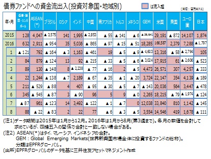 GEMが3カ月連続で流入超■EPFRグローバル(*)で世界の「投信マネー」動向を見ると、株式ファンドは新興国ファンド(GEM)への8月までの3カ月間の流入超額が際立ちました。米国は2カ月連続の流入超で、GEMへの流入超過額はそれを大きく上回りました。米景気の回復期待や米利上げが極めて緩やかであることに対する信頼回復が背景と考えられます。インドも3カ月連続の流入超でした。(*)EPFRグローバル:米国マサチューセッツ州に本社を置く金融商品の調査会社。2016年7月末現在、26.1兆米ドル規模の世界のファンドの資金フローデータを持つ。