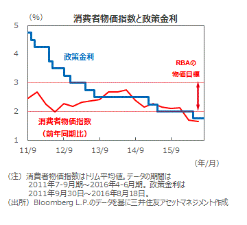 ■一方、物価は落ち着いています。直近16年4-6月期の消費者物価上昇率(※)は、前年同期比+1.7%となりました。RBAの目標値同+2%-+3%の下限を下回った状況が続いています。
