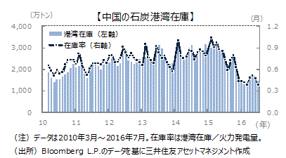 中国の生産がマイナスに■石炭市況については、中国政府による鉱山の生産能力削減や減産指導が特に大きな要因となっています。昨年末の中央経済工作会議で、中期的に石炭鉱山の生産能力を5億トン(生産量の13%相当)削減するほか、当面操業を年間330日から276日に抑える目標も設定されました。この結果、中国の生産が減少に転じ、在庫が減少してきました。