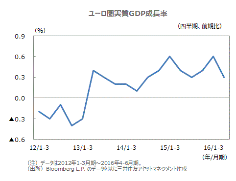 4-6月期GDPは0.3%増■2016年4-6月期のユーロ圏の実質GDP改定値は、速報値と同じ前期比+0.3%でした。1-3月期(同+0.6%)からやや鈍化しましたが、プラス成長を維持しています。ただし、6月23日の国民投票で英国がEU離脱(Brexit)を選択した影響は、今回のGDP統計にはほとんど反映されていません。