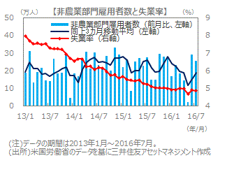 増加基調に変化は見られない■2016年7月の非農業部門雇用者数は前月比25.5万人増となり、市場予想(ブルームバーグ集計)の同18.0万人増を上回りました。