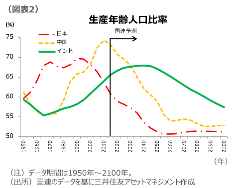 インドは生産年齢人口の増加が続くインドの経済成長率見通しが高い背景には、若年層の人口増があります。国連統計によれば、インドの生産年齢人口(15-64歳)は2040年頃まで増加することが見込まれています(図表2)。人口増は、中長期的な経済成長の牽引役となると考えられます。