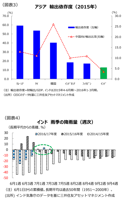 雨季の多雨によりインフレ率が低位で安定すれば、インド準備銀行は金融緩和路線を継続すると見られます。また、雨季の降水量が多くなれば、農作物の収穫が増加し、人口の7割が住む農村部の消費の伸びも期待されます。
