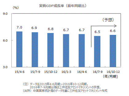 市場予想を上回る■中国国家統計局が発表した16年4-6月期の国内総生産(GDP)は、物価変動を除く実質で前年同期比+6.7%でした。習近平指導部の16年の目標である「6.5-7.0%」の範囲内であり、市場予想(ブルームバーグ集計、6.6%)をわずかに上回りました。