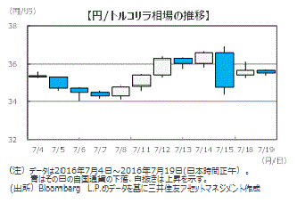 トルコ株も大幅安■クーデターの発生を受け、トルコリラは対ドル、対円ともに売られ、対ドルでは2.89リラ付近から一時3.05リラ付近へ約5.5%下落し、対円では36.5円付近から34.4円付近へ約5.8%下落しました。週明け月曜日(7/18)のトルコ株式市場も下落し、イスタンブール100種指数は前日比7.1%安となりました。いずれも、トルコに対する投資家心理の冷え込みが表れました。