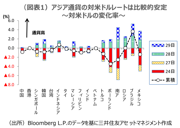 英国の欧州連合(EU)離脱ショックでもアジア金融市場は比較的安定6月23日の英国民投票は、予想外の「Brexit」となり、世界に衝撃が広がりました。多くの金融市場では一斉にリスクオフの動きとなり、為替市場では、英ポンドが急落したほか、ポーランドや南アフリカなどのエマージング市場の通貨が急落しました(図表1)。