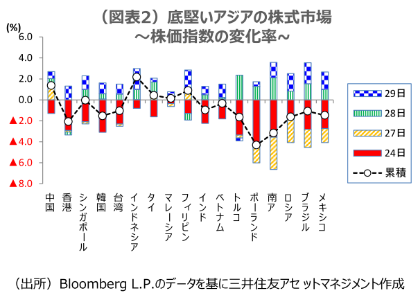 しかし、多くのアジア通貨の対米ドルレートは比較的安定的に推移しました。同時に、「Brexit」ショック直後の株式市場でも、他の地域の新興国と比べて、アジアの株式市場は底堅さを示しました(図表2)。