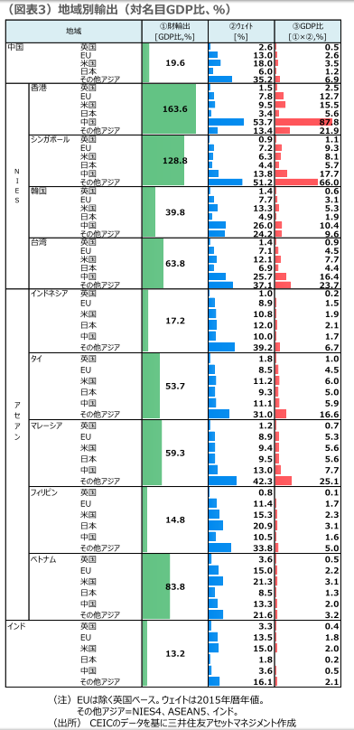 「Brexit」によるアジア経済への影響は軽微多くのアジア諸国は、中国をはじめとするアジア向け輸出比率が高い一方、英国、EU向け輸出比率は低いため、「Brexit」による貿易面からのアジア経済への影響は軽微であると考えられます(図表3)。また、アジアではアセアンを中心に自由貿易の流れが定着しており、保護主義的な動きの影響を受けにくいこともアジアの金融市場が「Brexit」の連想売りを受けにくい一因と見られます。
