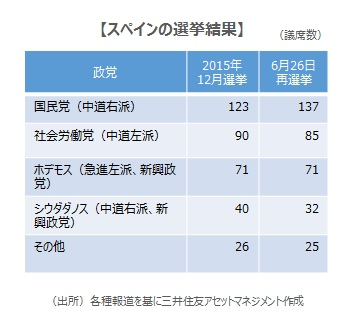 事前予想と異なり、有権者は安定性を選択■スペインで6月26日に行われた「再選挙」は、ラホイ首相が率いる中道右派の国民党が下院で14議席増やして137議席を獲得し、第1党を維持しました。中道左派の社会労働党は85議席で5議席減、ポデモス連合は改選前と同じ71議席、シウダダノスは32議席で8議席減でした。