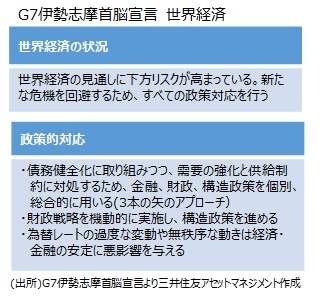 成長経路達成に向け3本の矢のアプローチの重要性を再確認■G7伊勢志摩サミットの首脳宣言(世界経済)では、世界経済の見通しに下方リスクが高まっているとし、「すべての政策対応」を行うとの認識が共有化されました。成長経路の達成に向けて3本の矢のアプローチ(相互補完的な財政、金融及び構造政策)の重要性も再確認しました。
