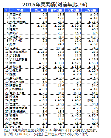 内需堅調、資源関連低迷■東証1部上場企業(除く金融)の2015年度の決算発表状況は、売上高が前年同期比+0.2%、営業利益が同+13.5%、経常利益が同+3.3%、当期利益が同▲0.9%、となった模様です。