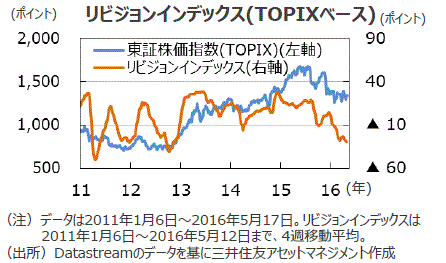 ■業績の失速とともに、リビジョンインデックス(業績が上方修正された企業から下方修正された企業の比率を差し引いた指数)は、マイナス圏に大きく低下しています。株価も歩調を合わせて下落しており、現在の企業業績停滞は株価に織り込まれていると思われます。