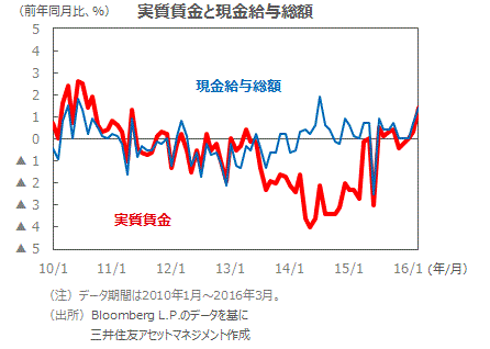 実質賃金が5年半ぶりの高い伸び:今後の消費を下支え【デイリー】2016年5月10日