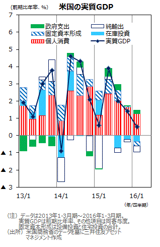 設備投資、在庫投資が減少■米商務省が4月28日に公表した2016年1-3月期の実質GDP成長率(速報値)は、前期比年率+0.5%にとどまりました。前期の+1.4%はもとより、市場予想の+0.7%も下回りました。