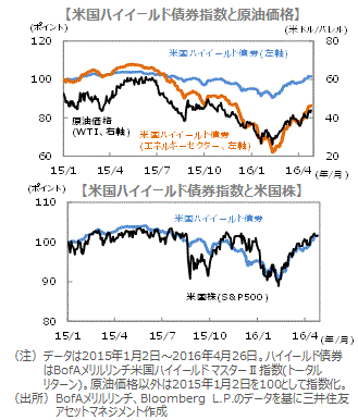 原油価格の反発がプラスへ■米国ハイイールド債券指数は、年初来安値となった2月11日から4月26日で12%上昇しました。原油価格(ウエスト・テキサス・インターミディエート、WTI)の反発などを受け、エネルギーセクターが回復傾向を強めたことなどが背景です。