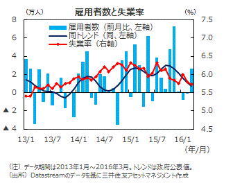 家計セクターは底堅く推移■2016年3月の雇用者数は前月比2.6万人の増加となりました。雇用統計は月ごとの変動が激しいため、変動を均した政府公表のトレンド値を見ると、3月は同+0.8万人でした。前月の+1.2万人からは鈍化しましたが、企業マインドが改善していることから、今後、雇用の勢いは再び強まる見込みです。一方、失業率は同0.1%ポイント低下の5.7%でした。