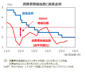政策金利は当面、据え置き■15年10-12月期の消費者物価上昇率は、前年同期比+1.7%でした。前期の同+1.5%からは加速しましたが、豪州準備銀行(RBA)の目標である+2%-+3%の下限を下回っています。