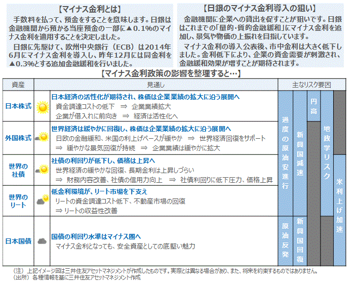 A:一般に、幅広い年限の金利が低下し、企業の借入れが有利になることから経済が活性化する要因と言えます。企業業績にもプラスとなることから、株式などのリスク資産にも好影響が期待されます。【マイナス金利とは】