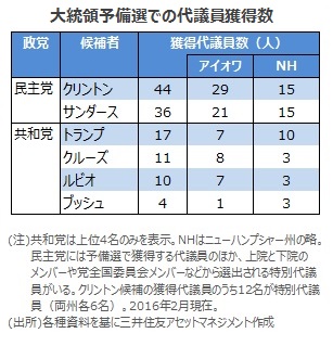 米国大統領選に向けて各党の候補者争いが激化しています。2月1日アイオワ州の党員集会、9日ニューハンプシャー州の予備選挙まで終了した状況で、民主党ではクリントン氏、共和党ではトランプ氏がリードしています。ただ、民主党はサンダース氏が善戦する一方、共和党でも戦前の世論調査が示唆していたほど、トランプ氏に票が集まっているわけではありません。両党とも「大統領候補」指名争いは、もうしばらく混戦が続きそうです。