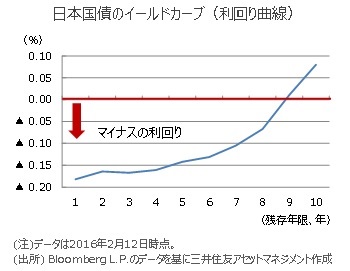 ■短期から長期までの国債利回りを結んだものをイールドカーブ(利回り曲線)といいますが、一部の期間の利回りはすでに▲0.1%を下回っています。これは日銀が▲0.1%を下回る利回りの国債も買い入れるとしているためです。
