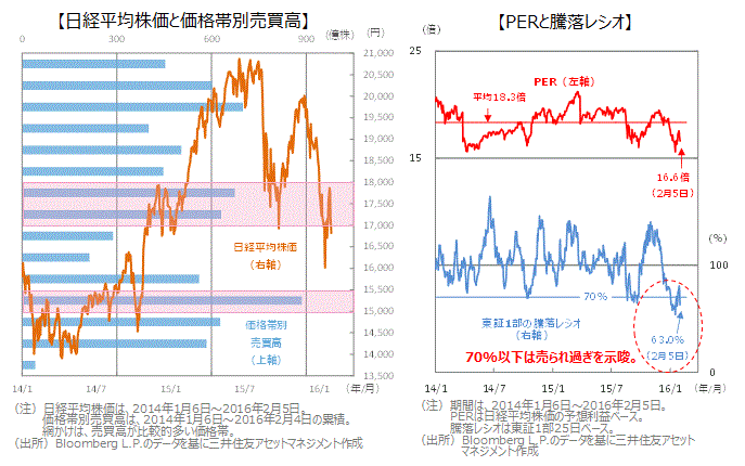 ■日経平均株価は足元で、売買高の比較的多い17,000円台を下回っていますが、PER(株価収益率)なども踏まえると、行き過ぎ感がうかがわれます。
