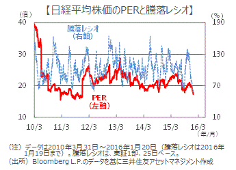■株式市場はリスク要因を過度に織り込んでいると見られ、売られ過ぎや割安さを示す指標が目立っています。東証1部の騰落レシオは、売られ過ぎとされる70%を、1月7日以降続けて下回っています。日経平均株価のPER(株価収益率)は、20日に17.3倍となり2011年末以来約4年ぶりの割安さを示しています。
