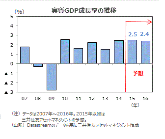 個人消費など内需がけん引■2015年の米国経済は、悪天候や港湾スト、中国の人民元切り下げを契機とする世界的な金融市場の混乱などにより鈍化する局面もありましたが、年間では+2.5%程度の成長となる見込みです。