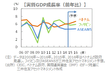 ■ベトナムは輸出依存度が高いですが、中国経済が減速する中でも対中輸出は堅調を維持しています。ベトナムを対中輸出の拠点とするアジア企業が増加しているためです。また、環太平洋パートナーシップ協定(TPP)が発効すれば、より恩恵を受けることとなります。ベトナム政府によれば、2016年の実質GDP成長率は6.7%が目標となっており、両国がASEAN経済をけん引する見通しです。