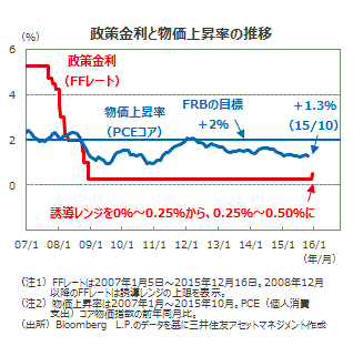 労働市場の改善などを受け■12月15日-16日の米連邦公開市場委員会(FOMC)で、市場の予想通り政策金利(FFレート)の0.25%引き上げが全会一致で決まりました。FFレートの誘導レンジは0.25%-0.50%となりました。2008年12月の利下げ以来およそ7年振りの政策金利変更になります。