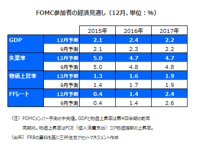 ■FOMCメンバーによる経済見通しによれば、16年の政策金利は前回と同じく1.4%でした。年4回程度の利上げということになります。