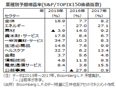 素材は小幅減益■業種別に2015年の予想増益率を見ると、素材が▲3.9%と小幅に減益の見通しです。その他はエネルギー、公益事業を除く業種で増益となる見通しです。増益率では、一般消費財・サービス、ヘルスケアなどの大幅増益が見込まれます。高齢者の消費や訪日外国人の増加による需要拡大が好調な業績に結び付いています。